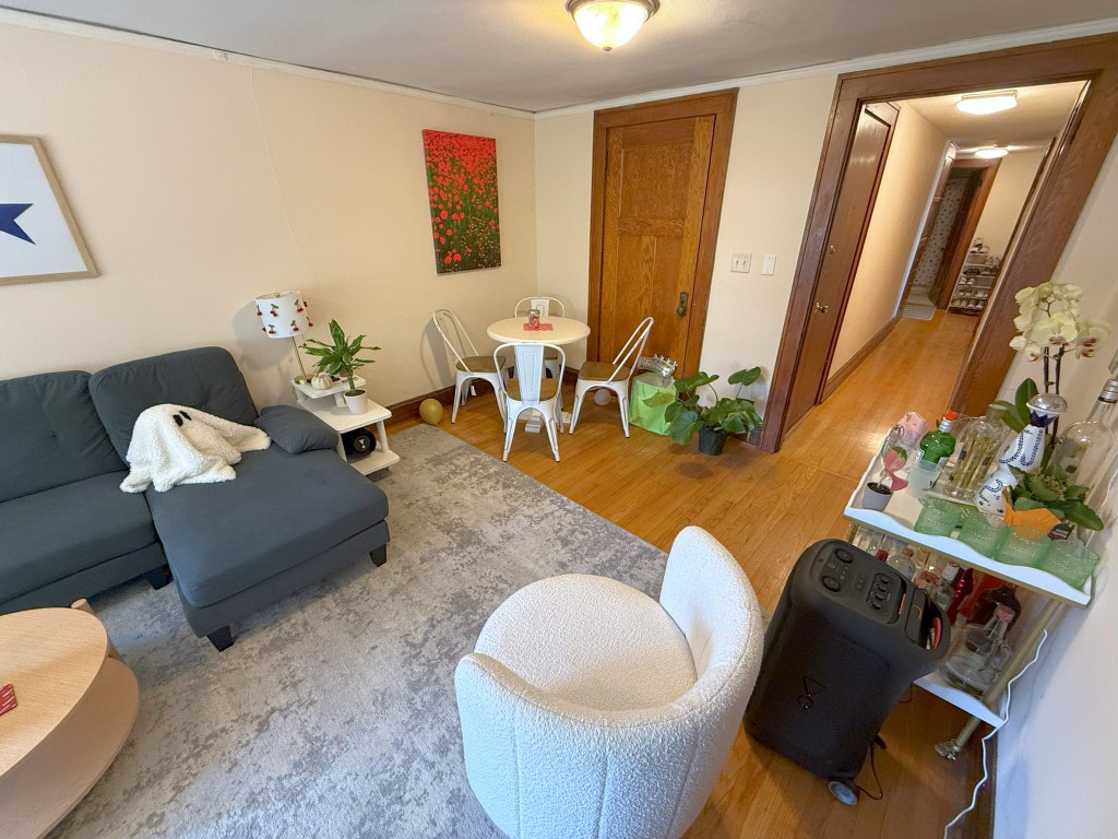 Features include two Kitchens, 2 Baths and hardwood floors. Shared common Basement includes Laundry and an extra 1/2 bath for emergencies.