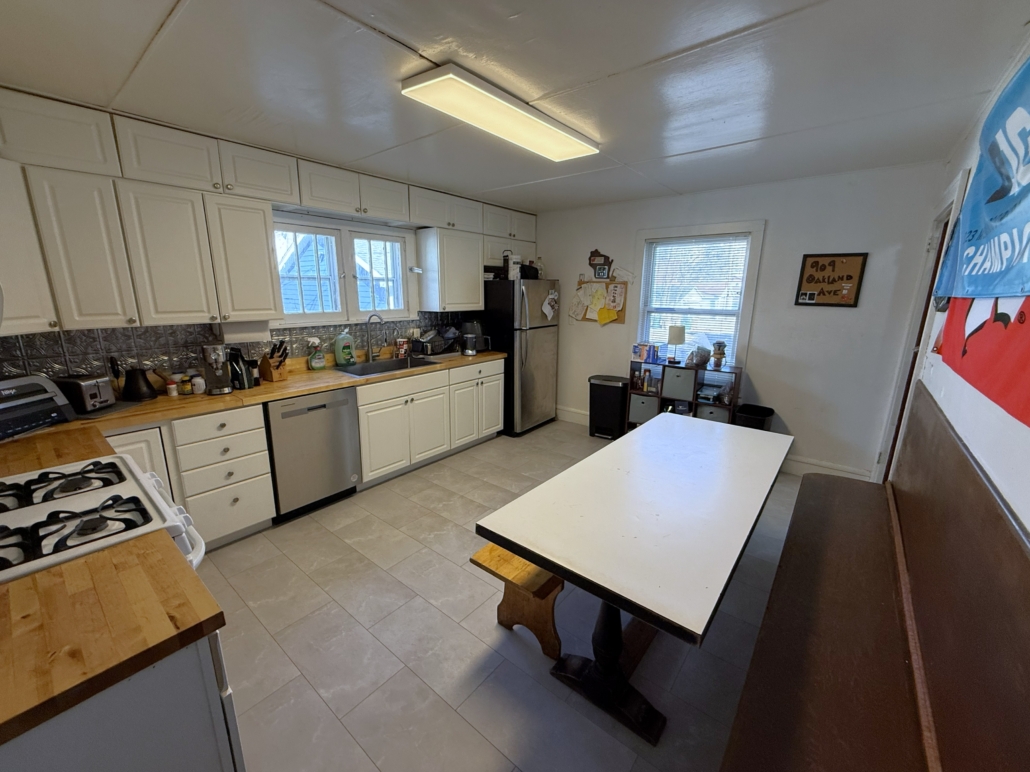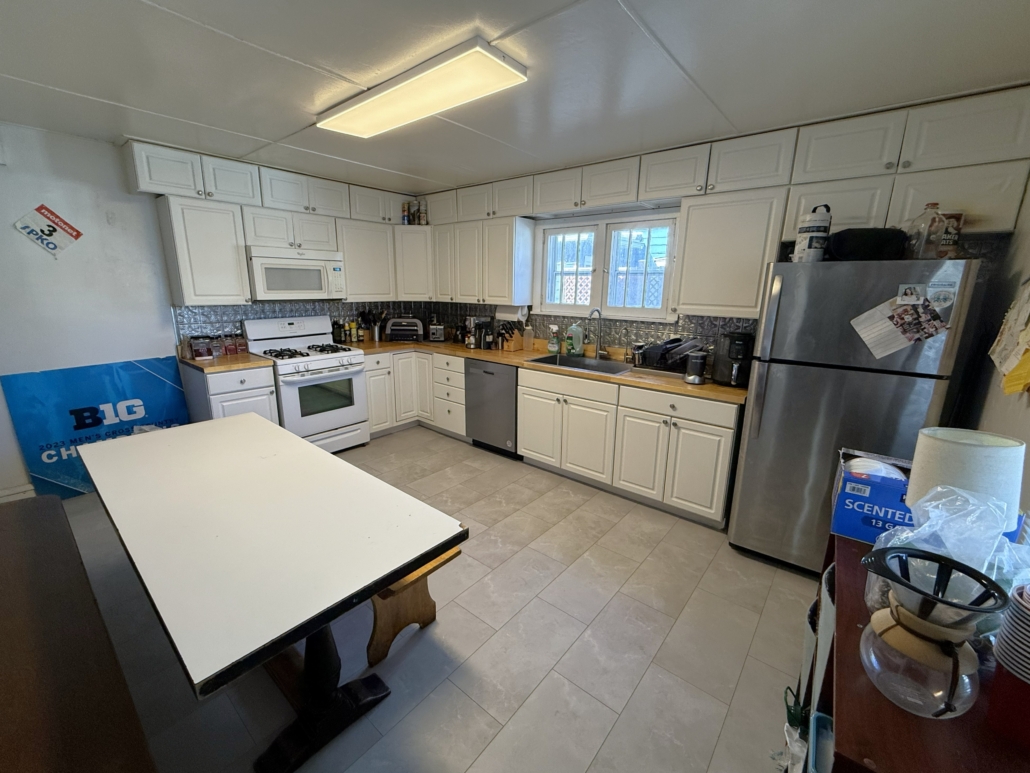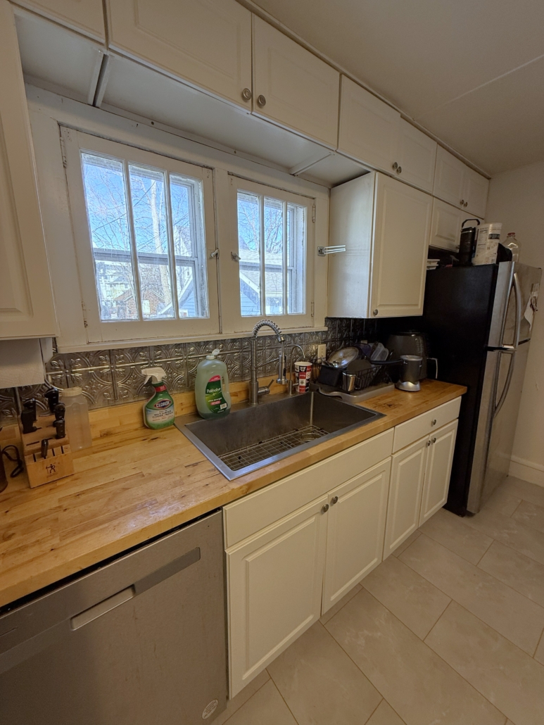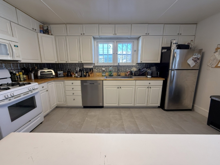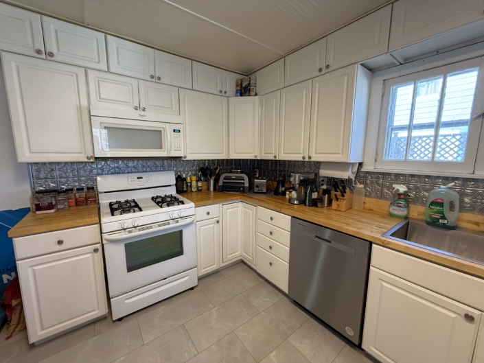 This house comes with a large eat-in Kitchen with a ton of cabinet space, sealed butcherblock countertops, dishwasher and an above-stove microwave.